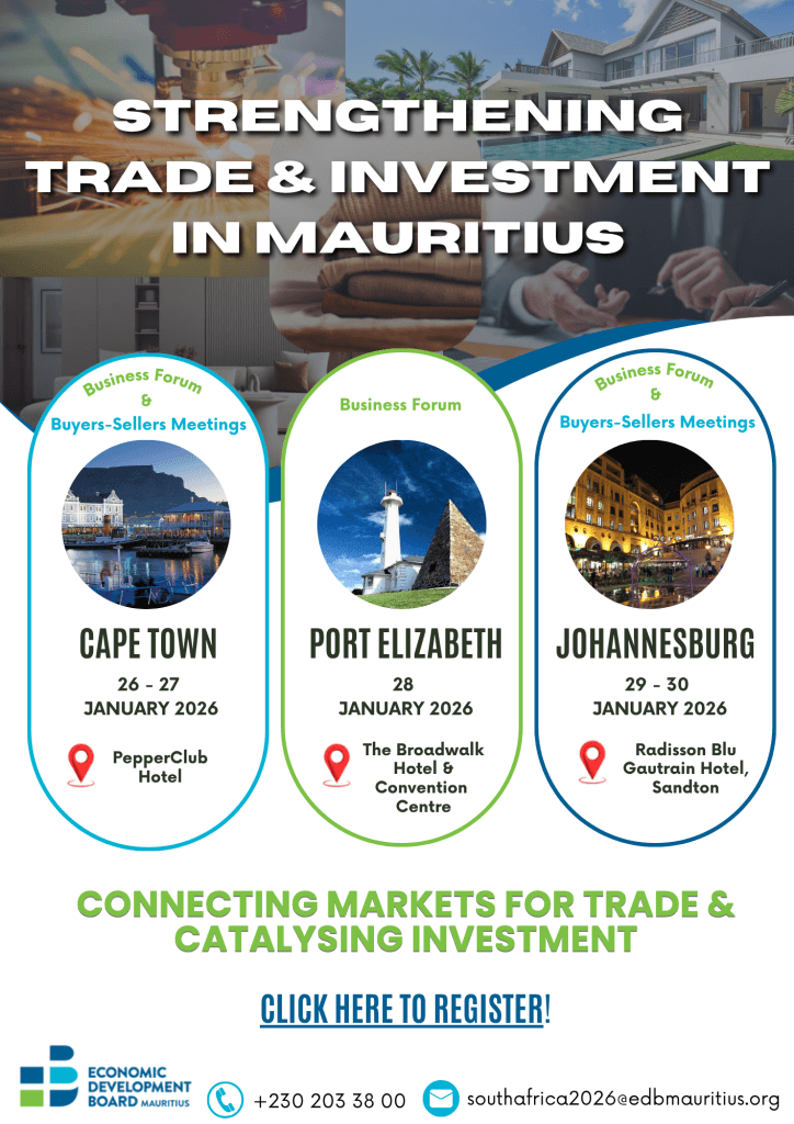 The Economic Development Board (EDB) is organising a Mauritius Trade & Investment Promotion Mission to South Africa from 26 to 30 January 2026 in Cape Town, Port Elizabeth and Johannesburg. The objective of this mission is to strengthen business linkages and promote new opportunities for trade and investment between Mauritius and South Africa.
