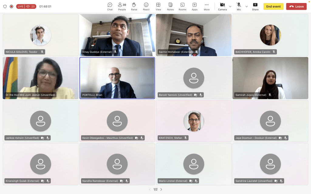 The webinar saw the participation of distinguished guests, namely Dr. The Hon. Mrs. Jyoti Jeetun, Minister of Financial Services and Economic Planning; Mr. Gunther Beger, Managing Director at UNIDO for the Directorate for SDG Innovation and Economic Transformation. Over 50 participants attended the webinar.
